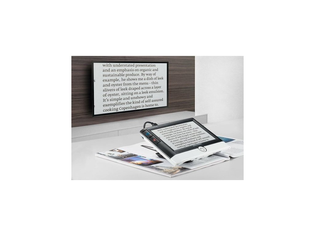 VÝHODY PRO ZÁKAZNÍKY: Nejlepší kvalita a funkčnost zobrazení. Příjemná pozice pro čtení. Bezpečné rozmístění prvků a vedení lupy. Široké zorné pole a věrná reprodukce barev. Zobrazí celý sloupek novin. Možnost výběru různých barev textu. Intuitivní ovládání. Ideální řešení na cestách nebo doma. Lehká, kompaktní, robustní a trvalé mobilní použití. Lze použít také jako čtečku obrazovky.